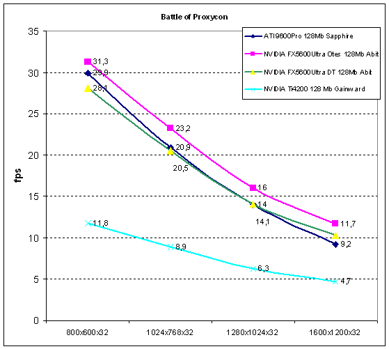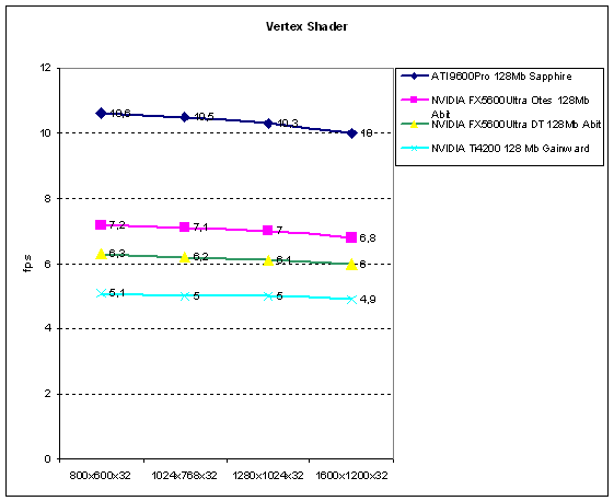 Если в тестах "Battle Of Proxycon", "Troll`s Lair" и "Wings Of Fury" производительность 9600Pro была как раз между новым и старым ядром FX5600Ultra, то, как только появляется работа с шейдерами - налицо явное преимущество ATI.