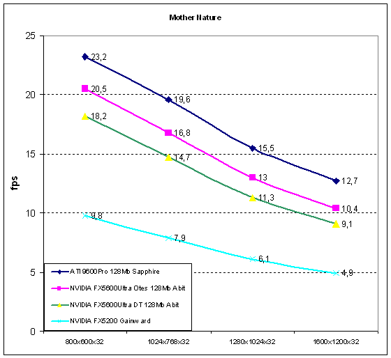 Как видим, какой-то прирост есть, но не критичный. Обычным разгоном Ti4200 вполне можно поднять с его 12456 попугаев до 13812, который выдала R9600Pro. Суть появления нынешнего поколения карт - повышенный функционал в лице DX9.