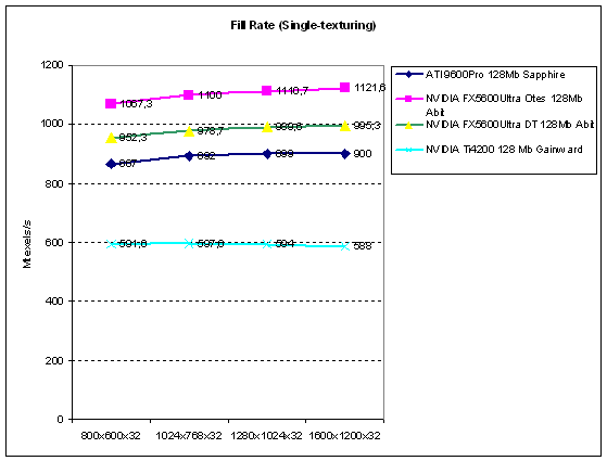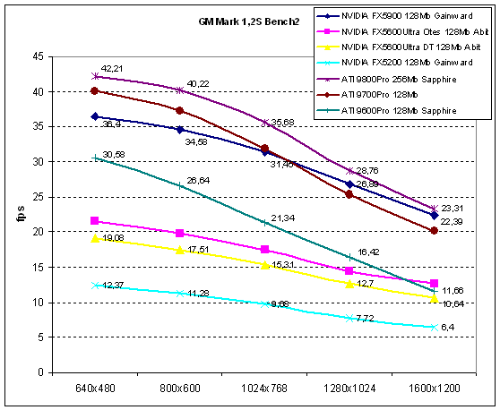 Кстати, тест доживает последние месяцы жизни... карты высшего уровня (FX5900 и R9800Pro) выдают всего две цифры - на разрешении 1280x1024 и 1600x1200, причем линия, соединяющая две точки, находится в правом верхнем углу. Еще чуток и все что останется от теста - это одна единственная точка в разрешении 1600x1200, на чем время жизни теста и закончится.