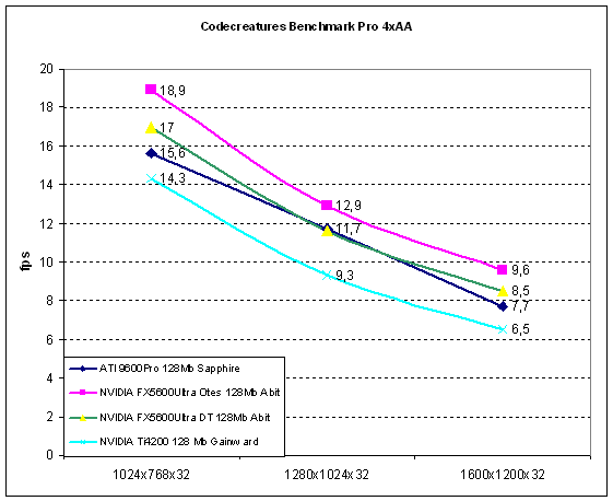 Без включенного AA прошлогодний Ti4200 с легкостью обгоняет FX5600Ultra, что со старым ядром, что с новым. А ведь это не синтетический тест, а самое что ни есть реальное игровое приложение. При включении сглаживания картина резко меняется и всё становится на свои законные места. Тем самым подтверждаются слова Алана Тике, об оптимизации современных карт исключительно на качество изображения. Можно серьезно поспорить с его словами о "достаточности 30 fps", но факт остается фактом - катастрофического падения производительности при включении функций улучшения изображения теперь не происходит. Впрочем, в любом случае карта ATI9600Pro в этом тесте выглядит куда более увереннее.