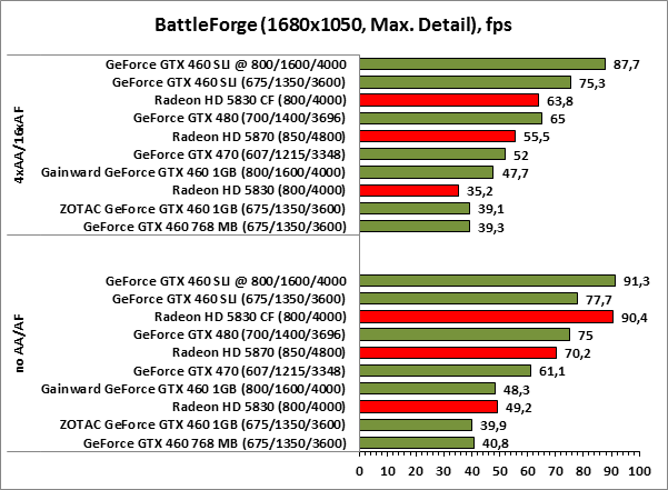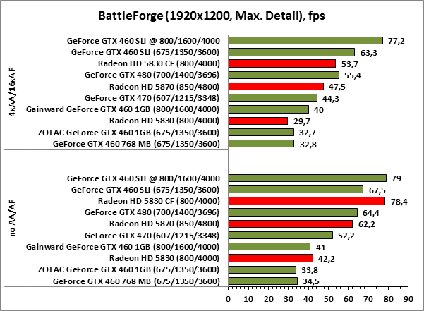 В игре Battle Forge без активации полноэкранного сглаживания и анизотропной фильтрации SLI-связка из двух GeForce GTX 460 1 Гб оказывается быстрее одиночной видеокарты GeForce GTX 480, но эта разница невелика и составляет менее 5%, что вряд ли будет заметно невооружённым глазом. Однако с переходом к тяжёлым режимам отрыв SLI-конфигурации становится больше и составляет уже около 15%, что весьма существенно.