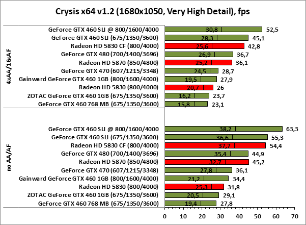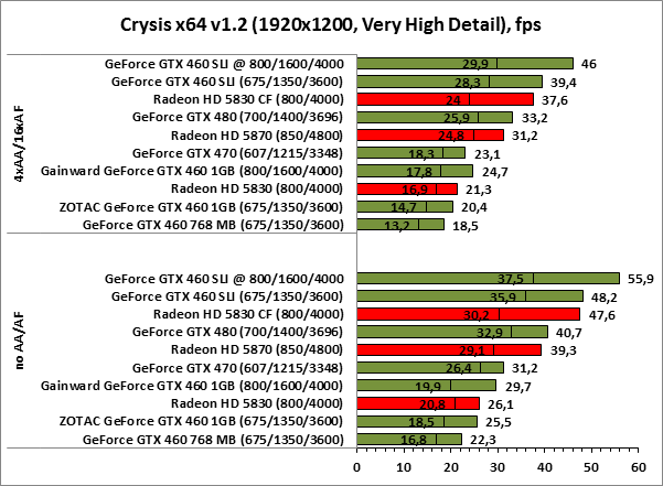 Если посмотреть на значения минимальной частоты смены кадров в игре Crysis, то разница между GeForce GTX 460 1 Гб SLI и GeForce GTX 480 совсем невелика, однако среднее значение fps у SLI-связки примерно на 20% выше. Что касается Radeon HD 5830 CrossFire, то в Crysis у этой связки проблем с производительностью нет. “Красный тандем” успешно обходит Radeon HD 5870 и GeForce GTX 480, при этом практически на равных соревнуется с GeForce GTX 460 1 Гб SLI.