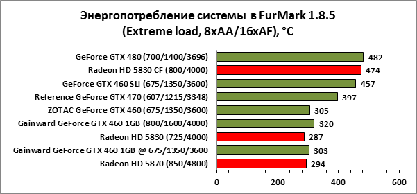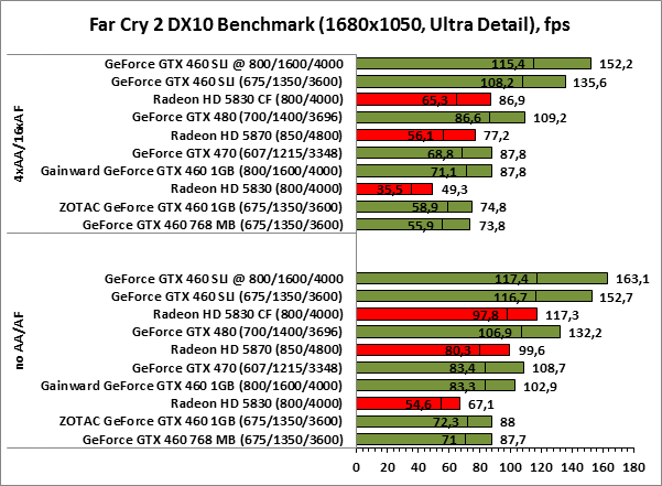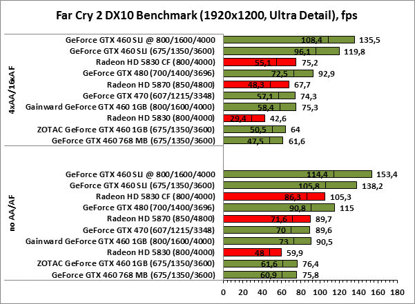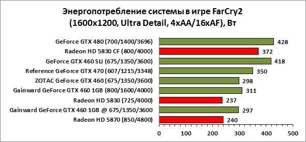 В игре Far Cry 2 в лидерах по количеству потребляемой энергии оказалась система с GeForce GTX 480, следом за ней идёт система с GeForce GTX 460 1 Гб SLI и, наконец, замыкает тройку лидеров CrossFire-связка из двух Radeon HD 5830.