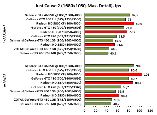Как мы уже отмечали в нашем предыдущем материале, весьма впечатляет уровень оптимизации игры Just Cause 2 под графические ускорители AMD. Обратите внимание, что Radeon HD 5870 наконец-то обошёл не только своего основного соперника, GeForce GTX 480, но и связку GTX 460 1 Гб SLI! Результаты, полученные на Radeon HD 5830 CrossFire, вообще вне конкуренции. Даже разгон не помогает GeForce GTX 460 1 Гб SLI, и лишь в разрешении 1920x1200 с включенным сглаживанием и фильтрацией разогнанная пара GeForce GTX 460 1 Гб смогла вплотную приблизиться к тандему Radeon HD 5830 CrossFire.