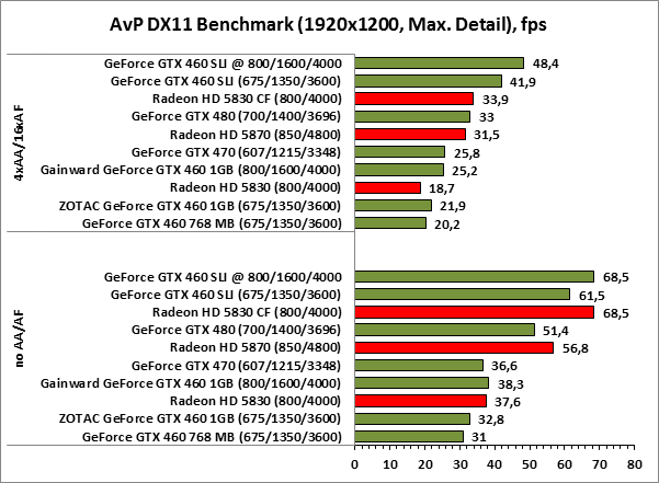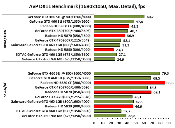 Если вы постоянно следите за нашими обзорами, то наверняка знаете, что мы уже не раз описывали общую расстановку сил между "красными" и "зелёными" в игре Alien versus Predator. Ничего не изменилось и в этот раз. Красные лидируют в лёгких режимах, в то время как продукты NVIDIA немного сильнее в тяжёлых. Без сглаживания и фильтрации Radeon HD 5870 оказывается быстрее GeForce GTX 480, а Radeon HD 5830 CrossFire идет на равных и даже обгоняет разогнанную связку GeForce GTX 460 1 Гб SLI. После активации полноэкранного сглаживания "зелёные" выходят в лидеры. Конечно, GeForce GTX 480 не обгоняет Radeon HD 5830 CrossFire, однако тандем GeForce GTX 460 1 Гб оказывается впереди всех, заметно отрываясь от преследователей после разгона.