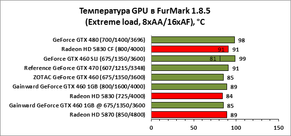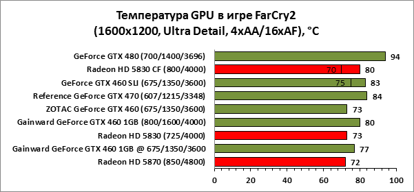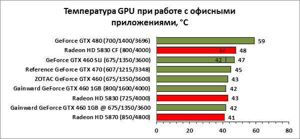 На графиках с результатами измерений температуры графических чипов для SLI-конфигураций приведены два значения - для ведущих (большие значения) и ведомых видеокарт. В нашем случае ведомой видеокартой была GeForce GTX 460 1 Гб GLH производства Gainward, а ведущей, соответственно, ZOTAC GeForce GTX 460 1 Гб. В случае с видеокартами Radeon HD 5830 ведущим был экземпляр AMD, а видеокарта ASUS EAH5830 DirectCU - ведомой.