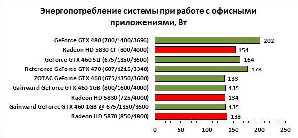 В офисном режиме, благодаря технологиям энергосбережения, количество энергии, потребляемой системой с тандемом из GeForce GTX 460 1 Гб, оказалось примерно на 40 Вт меньше, чем в случае с GeForce GTX 480, и примерно на 30 Вт больше, чем у системы с Radeon HD 5870. Что касается системы с Radeon HD 5830 CrossFire, то в офисном режиме она оказалась более экономичной, нежели GeForce GTX 460 1 Гб SLI.