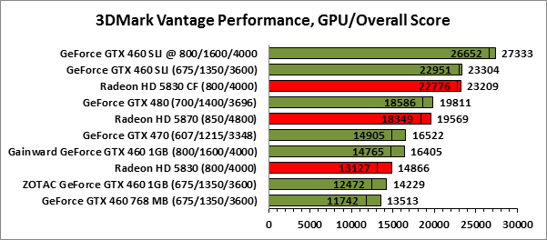 Тестовый пакет 3DMark Vantage при любых настройках качества графики демонстрирует довольно существенный отрыв не разогнанной пары GeForce GTX 460 1 Гб от старших одночиповых моделей NVIDIA и AMD. В режиме Performance отрыв SLI-связки GTX 460 1 Гб от GeForce GTX 480 составляет около 17%, в режиме Extreme увеличиваясь до 26%. И если проигрыш Radeon HD 5870 вполне компенсируется примерно на 3000 рублей меньшей ценой, то в случае с видеокартой GeForce GTX 480 всё не так просто, ведь её стоимость даже больше чем у пары GeForce GTX 460 1 Гб. Что касается результатов, полученных на CrossFireX-связке Radeon HD 5830, то в режиме Performance она показывает равную с GeForce GTX 460 1 Гб SLI производительность, однако с переходом к более "тяжелым" режимам сдаёт свои позиции, отставая от конкурента примерно на 10-15%. Посмотрим, как будут обстоять дела в реальных играх.
