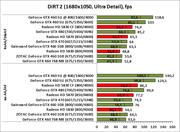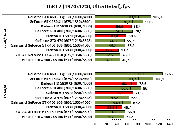 Что касается связки из пары Radeon HD 5830, то в DiRT 2 она показывает далеко не лучшие результаты. Превосходство Radeon HD 5830 CrossFire наблюдается лишь над Radeon HD 5870, причём во всех без исключения режимах. Однако с GeForce GTX 480, и тем более с GeForce GTX 460 1 Гб SLI, сладкая парочка от AMD справиться уже не в состоянии. Если внимательно посмотреть на результаты, то вполне очевидно, что проблемы с производительностью CrossFire-тандема Radeon HD 5830 связаны с недостаточной масштабируемостью результатов после включения режима CrossFire. Прирост fps от добавления в систему второй видеокарты Radeon HD 5830 не превышает 60%, что не много. Скорее всего, проблема кроется в недоработанных драйверах, поскольку, на примере GeForce GTX 460 мы видим хорошую масштабируемость результатов при включении режима SLI, а значит с движком игры проблем нет.