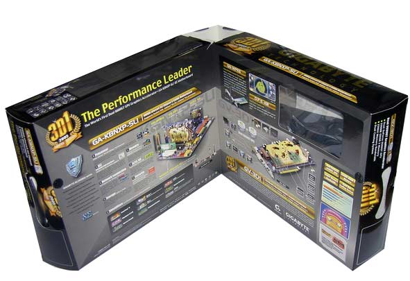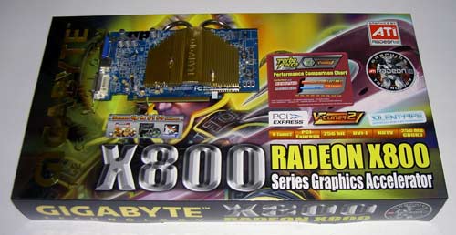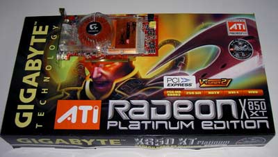 Посмотрим на плату - это "чудо природы", а точнее - инженеров Gigabyte. На одной РСВ размещены, фактически, две независимые платы на базе GeForce 6600GT, связанные между собой по технологии NVIDIA SLI. Каждая плата несет на борту по 128Mb памяти с шиной передачи данных 128Bit. То есть, суммарный объем видеопамяти равен 256Mb, однако система видит только 128, так как каждый GPU использует только "собственные" 128Mb видеопамяти со 128-bit шиной.  Данная карта способна работать на сегодняшний день только на системной плате GA-K8NXP-SLI. Это связано с тем, что, так как Gigabyte, по сути, реализовала SLI на одной карте, то слот PCI-E x16, в который устанавливается 3D1, превращается в сдвоенный х8. И получается, что система видит не одну, а две видеокарты, так как 16 линий слота "делятся напополам".  Данная особенность платы GA-K8NXP-SLI не позволяет пока использовать 3D1 на других материнских платах, но возможно, что Gigabyte введет поддержку данного режима и в других своих решениях. Особо отметим то, что при установке карты 3D1, switch-модуль на материнской плате следует устанавливать в Normal Mode (режим работы с одной видеокартой). При установке конфигурации из двух отдельных графических карт следует перевернуть модуль, установив его в SLI Mode.  Система охлаждения представляет собой массивный алюминиевый (стилизованный под медь) радиатор с двумя вентиляторами, охлаждающий оба GPU. Отметим, что восемь чипов видеопамяти, расположенные на лицевой стороне платы, данный радиатор не охлаждает, вследствие отсутствия какого бы то ни было контакта между микросхемами и радиатором. На карту установлено 2х128Mb видеопамяти с шиной передачи данных 128Bit, в виде восьми микросхем Samsung, выполненных в форм-факторе BGA, со временем выборки 1.6 ns, что соответствует частоте 625MHz (1250 MHz DDR). Отметим, что частота работы памяти на 3D1 является повышенной относительно рекомендованной на "обычной" GeForce 6600GT (1000MHz DDR), и составляет 1120MHz DDR. Обратите внимание на нестандартное расположение чипов памяти - под углом в 45 градусов. Это сделано для экономии места, иначе пришлось бы увеличивать в размерах PCB.  Оба графических процессора GeForce 6600GT (NV43) абсолютно идентичны, имеют по 8 пиксельных конвейеров, 3 вертексных юнита, и работают на стандартной для 6600GT частоте - 500MHz.  Так как потребление этого "гибрида" выходит за рамки 75Вт, карта требует подключения дополнительного питания.  Карта Gigabyte Radeon X850 XT PEКомплект поставки, как и положено флагманскому решению - шикарный:
