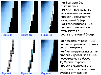 Красота данного метода заключается в том, что пиксели, не принадлежащие границам полигона, напрямую записываются в кадровый буфер, минуя FAA движок, что экономит драгоценную пропускную способность. В соответствии с данными Matrox, число фрагментированных пикселей находится примерно в границах от 5 до 10% от всех пикселей сцены. Вы можете представить, насколько такая технология позволяет увеличивать производительность при использовании сглаживания.