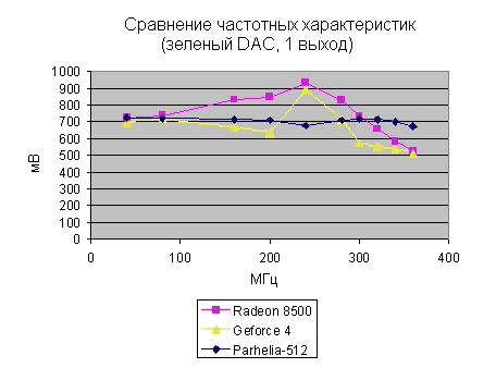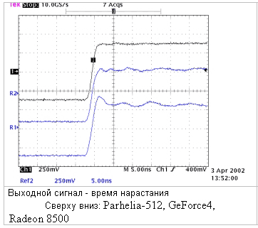 График показывает длительность времени нарастания сигнала на трех картах. Вы должны обратить внимание на то, сколько времени уходит на стабилизацию сигнала после достижения нужного уровня напряжения. Parhelia-512 стабилизирует напряжение почти мгновенно, в то время как Radeon 8500 это не удается совсем. Нестабильный сигнал приводит к размыванию текста на высоких разрешениях.