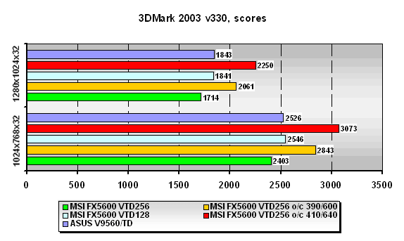 Как и ожидалось, платы MSI FX5600 VTD256 и MSI VTD128 не показывают одинаково уровня производительности из-за небольшого различия в клокинге по памяти (напомним, что у новейшей ревизии платы MSI FX5600 VTD256 понижена на 25 MHz (50 MHz), в то время как у первых карт MSI всё укладывалось в спецификации NVIDIA). Отставание MSI VTD256 хоть и небольшое, но есть. Также интересно отметить преодоление трёхтысячного рубежа "попугаев образца 2003 года" платой MSI FX5600 VTD128 в разрешении 1024х768, показавшей отличные результаты разгона как чипа, так и памяти.