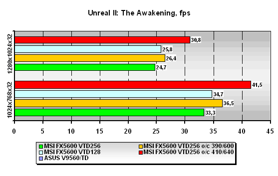 Также хотим отметить то, что плата MSI FX5600 VTD256 смогла только приблизиться с результатам номинала MSI FX5600 VTD128 в разогнанном режиме, что для платы такого класса, как MSI FX 5600 просто непростительно, но здесь также стоит учитывать специфику теста Unreal Tournament 2003, который к разгону не всегда хорошо чувствителен.