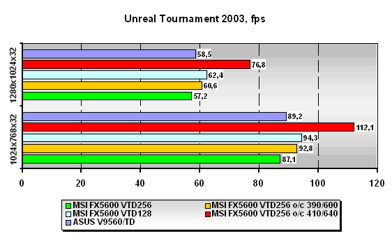 В Unreal Tournament 2003 расстановка сил примерно та же, за исключением нескольких особенностей. Во-первых, плата ASUS V9560/TD показывает существенно более низкий уровень производительности в сравнении с MSI FX5600 VTD128, что обусловлено использованием вкупе с MSI FX5600 VTD128 новых драйверов ForceWare 52.16 с переработанным компилятором пиксельных и вершинных программ, в то время как плата ASUS тестировалась совместно с Detonator 45.23.
