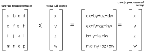 Сперва может показаться, что достаточно матрицы размерностью 3x3, лишь потому, что это расчеты 3D графики. Четвертый компонент в исходном векторе – w. W используется в качестве коэффициента масштабирования при перспективной коррекции и дополняет матрицу трансформаций до размерности 4x4. Углубленное обсуждение параметра w лежит за границами этого документа.