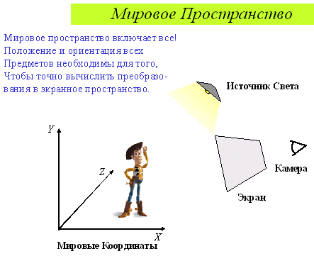 Процессы описания и отображения трехмерных графических объектов и сред весьма сложны. Эта сложность обусловлена тем, что нужно описать 3D-данные последовательно в различных системах координат или в различных системах координат в отдельные, выборочные, моменты времени. Эти различные системы координат описываются как разные "пространства"-“spaces”: мировое пространство (world space), пространство наблюдателя (eye space) и пространство экрана (screen space). Каждое из этих пространств удобно для одной или более операций, необходимых при создании 3D образа. "Мировое пространство" (world space) используется для охвата всех 3D объектов, являющихся частями 3D мира. "Пространство наблюдателя" (eye space) используется для освещения и отсечения, а "экранное пространство" (screen space) используется для сохранения сцены в графическом буфере кадра. Однако, из-за того, что эти пространства используют различные системы координат, 3D данные должны быть конвертированы или "трансформированы" из одного координатного пространства в другое при их перемещении по 3D конвейеру. Геометрический процессор выполняет все эти преобразования аппаратно. На рисунках 2 и 3 изображены примеры мирового пространства и экранного.