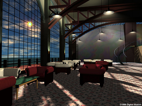 Интегрированный в GPU расчет освещения – наиболее критичное требование в современной 3D графике, т.к. имеет самое непосредственное отношение к качеству изображения. Расчет освещения – эффективный путь добавления плавных и любых других изменений яркости к 3D объектам, приближающим их по внешнему виду к тому, что мы привыкли видеть в реальности. Возможность реалистичного рендеринга сцены очень важна, т.к. делает восприятие 3D графики доступной и приятной для глаз самой широкой аудитории. Чем выше реалистичность графики 3D сцены, тем больше практических применений она будет иметь. Трехмерные приложения применяются по всюду: от развлечений до образования и науки, промышленности, медицины (синтез лекарств), анализа данных и т.д. Эффекты освещения добавляют выразительности всем 3D приложениям потому, что они придают реалистичную детализированность сцене. Человеческий глаз по своей природе более чувствителен к изменениям яркости (количеству градаций яркости), чем к количеству цветов. Проще говоря, эффекты освещения помогают лучше реализоваться возможностям человеческого глаза. Это означает, что образ со световыми эффектами предоставит наблюдателю гораздо больше информации за определенный промежуток времени, чем без эффектов. На Рисунке 5 изображена архитектурная сцена, демонстрирующая потенциал эффектов освещенности, примененных для добавления реализма сцене.Без интегрированного расчета освещенности будет невозможно в реальном времени точно отображать изменения свойств освещения 3D объектов при изменении положения камеры относительно источников света – для этого необходимо рассчитывать два важных для точного моделирования физики освещения параметра. Эти два компонента – рассеянный свет и отраженный свет. Под источником рассеянного света понимается источник, излучающий свет во все стороны с одинаковой интенсивностью так, что яркость отраженного от предмета света вообще не зависит от положения камеры. Солнечный свет на игровой площадке – пример рассеянного освещения в реальной жизни. Яркость объекта в 3D сцене прежде всего определяется расчетами рассеянного освещения. Отраженный свет отличен от рассеяного, т.к. зависит от положения камеры, направления на источник света и ориентации треугольника перед рендерингом. Сверкающий блик света на экране телевизора в темном углу комнаты поможет вам яснее представить отраженное освещение. Отраженный свет зависит от отражающей способности объектов, дающей эффект отражения и блика. На Рисунке 6 показаны два примера космической станции из теста 3DWinBench с эффектами рассеянного и отраженного света.