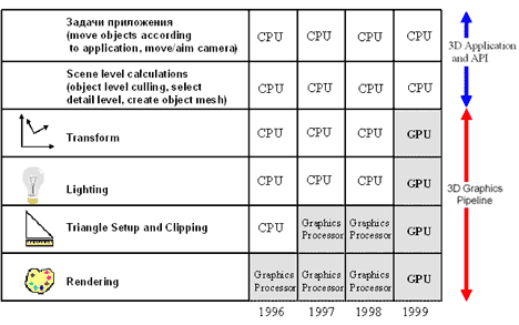 Вся работа в графическом 3D конвейере поделена между центральным процессором и графическим процессором. Грань, определяющая уровень разделения задач центрального процессора и графического процессора в конвейере, постоянно поднимается. 1999 год – год, когда графические процессоры с интегрированными T&L процессорами стали доступны по цене большинству пользователей персональных компьютеров. Рисунок 8 демонстрирует все возрастающую роль специализированных графических процессоров в основной массе персональных компьютеров за последние несколько лет. Сегодня графический процессор полностью обсчитывает все стадии графического конвейера, что и подразумевает термин GPU.