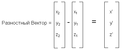 Здесь описана математика простейшей модели освещения. Вычисление разностных векторов требует только сложения (вычитание – это просто добавление отрицательного значения) данных xyz для каждого из объектов и поэтому требует три операции сложения. Для примера - разностный вектор между источником света #1 с координатами (x1, y1, z1) и объектом #2 с координатами (x2, y2, z2):