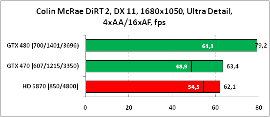 В игре Colin McRae DiRT2 для GeForce GTX 470 тоже все складывается не так плохо - она идет вровень с Radeon HD 5870, однако демонстрирует все же чуть меньший минимальный fps. Впрочем, на комфортности игры это никак не скажется.