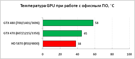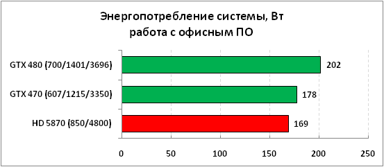 При работе в "офисном" режиме системы с установленными видеокартами Radeon HD5870 и GeForce GTX 470 показывают довольно близкие результаты, но первая все же чуточку экономичнее.