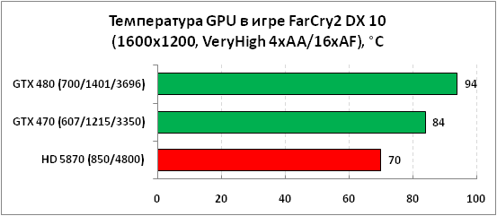 При продолжительном выполнении бенчмарка Far Cry 2 температуры всех рассматриваемых в этом тесте участников возрастают практически вдвое. Впрочем, общая расстановка результатов остается прежней, но температура GPU на GeForce GTX 470 уже оказывается ближе к показателям GeForce GTX 480, а не Radeon HD 5870. Скорость вращения кулера GeForce GTX 470 также несколько увеличивается и равна 2250 об/мин, при этом его шум становится отчетливо слышен на фоне остальных компонентов системы.