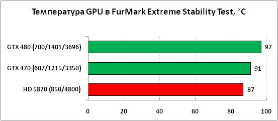 Стрессовая нагрузка на видеокарты с помощью теста FurMark приводит к тому, что температура GPU на старшей из представительниц NVIDIA практически достигает отметки 100 °C, Radeon HD 5870 немного не дотягивает до 90 °C, а GeForce GTX 470 немного превышает эту отметку. При этом скорость вращения ее кулера достигает 3200 об/мин (74% от максимума), что создает немало шуму. Впрочем, такие экстремальные нагрузки на GPU являются скорее исключением, чем правилом для игровых видеокарт, да и кулер довольно быстро сбрасывает обороты после перехода в 2D-режим.