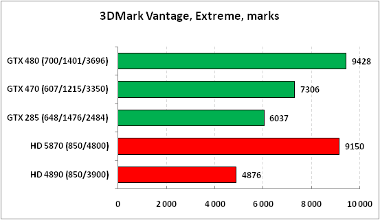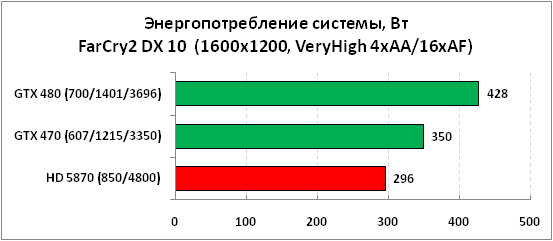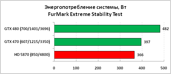 Максимальная нагрузка на видеосистему заставляет показатели энергопотребления еще немного подрасти, но здесь разница между стендами с GeForce GTX 470 и Radeon HD 5870 уже не так велика, а система с GeForce GTX 480 опережает их на сотню ватт.