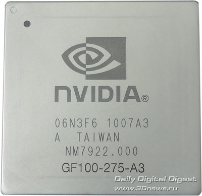 "Сердцем" видеокарты GeForce GTX 470 является чип GF100-275-A3, который содержит 448 унифицированных потоковых процессоров, а его частоты составляют 607 МГц для основных блоков и 1215 МГц для шейдерного домена.