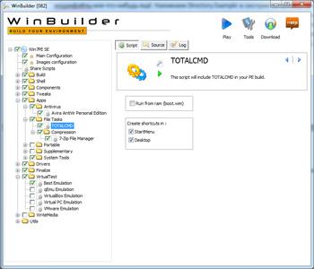 Приложения добавляются в сборку также при помощи скриптов, которые иногда называют ещё плагинами. Большой набор готовых скриптов можно найти здесь. Там же, на форуме разработчиков, есть и различные дополнения к WinBuilder. Скачанный скрипт нужно поместить в папку C:\WinBuilder\Projects\Win7PE_SE\Apps, в один из имеющихся подкаталогов, либо самому создать для удобства отдельные директории. После этого перезапускаем WinBuilder, включаем в сборку новые утилиты и при необходимости меняем их настройки. Заметьте, что для некоторых приложений придётся скачать их инсталлятор (обычно это происходит автоматически) или выполнить ещё какие-нибудь действия. Всё это должно быть описано в ReadMe скрипта.
