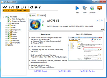 WinBuilder — это утилита для автоматической сборки live-дистрибутивов Windows XP, Vista или 7. Ну почти автоматической. Для сборки используются специальные скрипты, которые выполняются один за другим и добавляют или изменяют компоненты и настройки будущей системы. Для того чтобы самостоятельно подготовить сборку, нам понадобится дистрибутив Windows 7, желательно с уже интегрированным сервис-паком. Скопируйте все файлы с установочного диска или образа в какую-нибудь папку. Скачайте архив с последней версией WinBuilder с официального сайта и распакуйте его в любую папку, скажем, пусть это будет C:\WinBuilder. Некоторые антивирусы будут «ругаться» на сборщик или его скрипты, так что лучше умерить их пыл на время работы в WinBuilder. После распаковки запускаем утилиту и в панели внизу справа отмечаем галочками два пункта: updates.boot-land.net и win7pe.winbuilder.net/SE. Затем нажимаем Download и ждём, пока загрузятся все основные скрипты. Если по какой-то причине не все скрипты загрузились, а об этом будут сигнализировать оставшиеся включенными галочки в панели слева, то придётся удалить из папки с утилитой всё, кроме неё самой, и заново повторить загрузку. Можно попробовать сделать то же самое, но без очистки папки. Обратите внимание, что запускать WinBuilder надо исключительно с правами администратора!