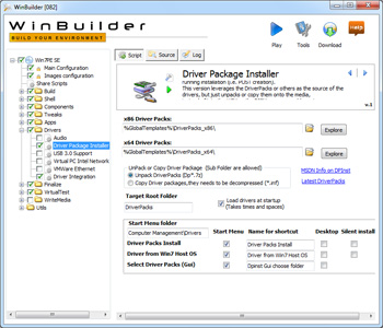 Всё готово? Отлично, теперь можно приступать непосредственно к созданию пробной сборки. Запускаем WinBuilder и начинаем настройку. Первым делом жмём кнопочку Source в правой части окна, где в разделе Source Directory указываем путь к нашей папке с установочными файлами Windows 7. Затем идём в раздел Drivers → Driver Package Installer. В нужном разделе (x86 или x64) жмём на кнопку Explore. Откроется папка, куда нам надо будет скопировать 7z-архивы с наборами драйверов, которые мы скачали ранее. Если нужны драйвера для каких-то специфических устройств, то их надо будет также скопировать сюда. (Только не копируйте файлы установщиков, скачанные с офсайтов производителя, — нам нужны лишь наборы *.inf,*.sys, *.dll или *.exe.) В VirtualTest отмечаем пункт Best Emulation. Вот, собственно, и всё — для пробной сборки всё готово. Нажимаем Play и ждём, пока отработают все скрипты, — скорость их выполнения зависит от мощности вашего ПК, но вряд ли придётся ждать больше получаса.