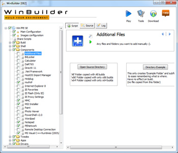 Проходимся по всем разделам и меняем или добавляем нужные настройки. В основной конфигурации можно без опаски поменять разрешение экрана по умолчанию и выбрать тему оформления для загрузчика — остальное трогать не рекомендуется. В Shell можно включить на выбор различные расширения для стандартного проводника Windows. В Components включаются/отключаются стандартные утилиты Windows 7. Здесь же в подразделе Additional Files можно добавить в сборку свои собственные файлы. Только не программы, а документы, медиафайлы или что-нибудь ещё. Нажимаем Directory Example и смотрим на пример того, какие папки могут быть использованы. Затем жмём Open Source Directory и копируем нужные нам файлы в соответствии с примером. В разделе Tweaks можно поменять, к примеру, обои на рабочем столе или включить заветный Aero-интерфейс и добавить боковую панель с гаджетами. Только учтите, чем больше вы выберете возможностей (скриптов, компонентов, файлов), тем дольше будет идти процесс сборки.