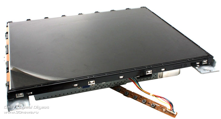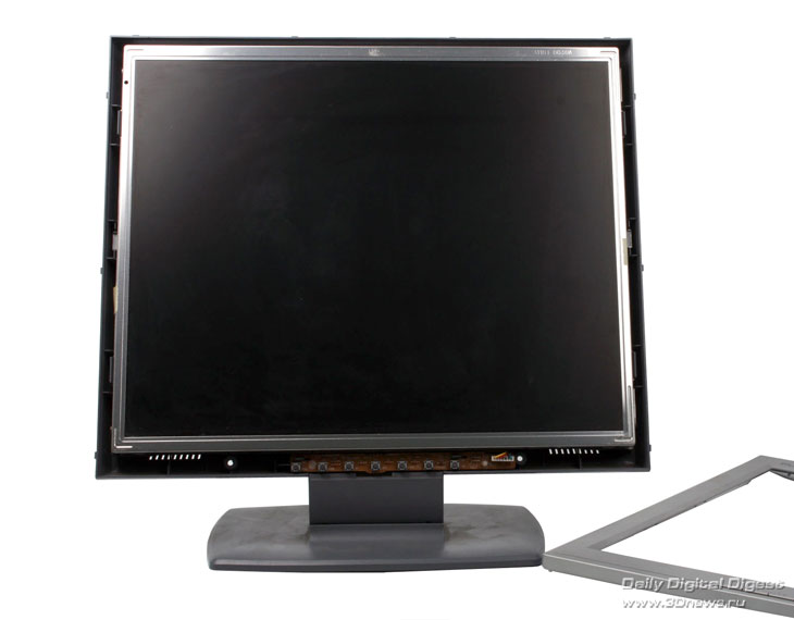 В нашем случае всё оказалось очень просто. Передняя рамка легко подделась плоской отвёрткой и была тут же снята с немногочисленных защёлок. Сам дисплей с блоком питания и прочей электроникой крепился двумя болтами к задней стенке. Обратите внимание, что различные части монитора могут быть скреплены небольшими шлейфами или пучками проводов. Так что будьте аккуратнее и не делайте резких движений при извлечении их из корпуса.