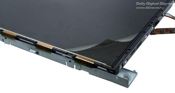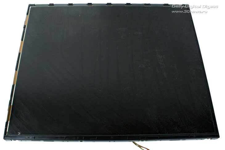 Теперь нам надо отделить поляризационный фильтр. Как правило, он выполнен в виде плёнки, которая прикрывает экран спереди. На самом деле, таких плёнок может быть несколько, например встречается антибликовое, матовое, защитное или ещё какое-нибудь покрытие. Плёночки эти могут быть полностью приклеены к матрице, приклеены только по краям, прикреплены скотчем, а то и просто прижаты внешней рамкой.