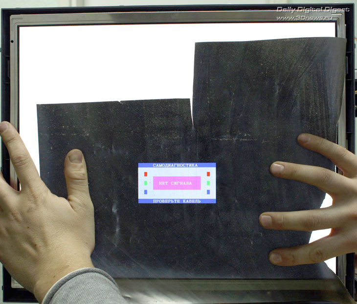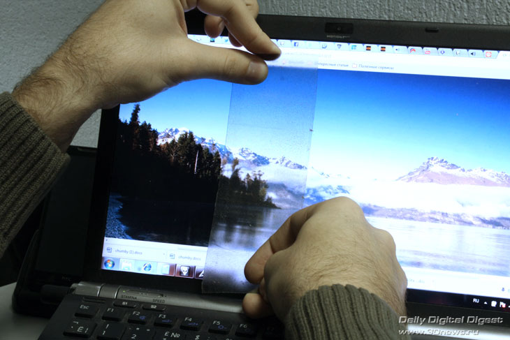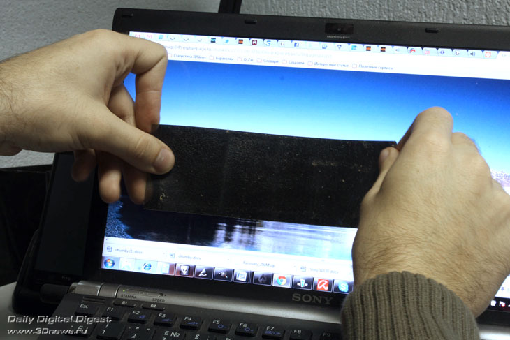 В нашем случае фортуна дважды повернулась известно каким местом. Во-первых, фильтр был полностью приклеен к матрице, а во-вторых — он, судя по всему, оказался единым целым с матовым покрытием. По крайней мере, разделить на слои отодранную плёнку не удалось. Основная проблема была в низкой прозрачности этой плёнки — хоть что-то увидеть можно было, лишь плотно прижав её к экрану. Таким образом, изготовить очки из неё не вышло и пришлось на скорую руку искать альтернативные варианты.