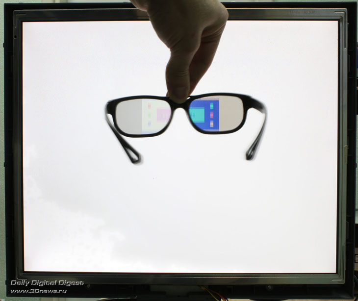 В реальной жизни этот «бутерброд» несколько сложнее, но нам это сейчас не так важно. А важны только два момента. Во-первых, из-за разной ориентации плоскостей поляризации обоих фильтров даже при включенной подсветке (и отсутствии входного видеосигнала) мы увидим лишь слабое свечение экрана, так как свет через фильтры практически не будет проходить. А это значит, что если убрать передний фильтр, то ничего хорошего мы на экране не узрим, кроме сильно бьющей в глаза подсветки. Во-вторых, никто не мешает разместить один из фильтров, например, в очках. В результате, надев очки, вы сможете видеть всё, что происходит на дисплее. А для посторонних вы будете выглядеть как странный человек в солнцезащитных очках, который зачем-то пялится в ослепительно белый экран.