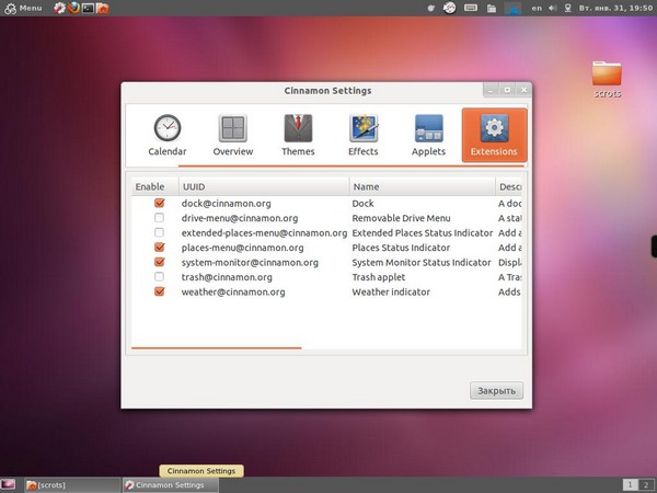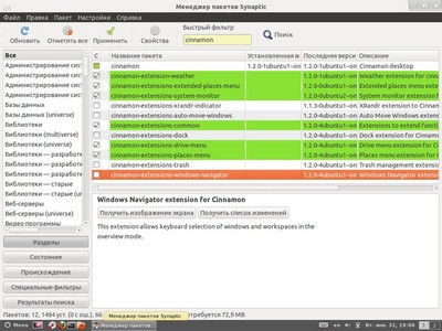 Теперь можно несколько разнообразить жизнь с Cinnamon. Открываем Synaptic (проще всего в поисковой строке в самом меню набрать начало названия программы — syn) и в фильтре вводим cinnamon. Среди неустановленных пакетов есть расширения, добавляющие немножко функциональности к рабочей среде. После установки они включаются в настройках Cinnamon в разделе Extensions. Чтобы они заработали после включения, надо перезапустить оболочку – выйти и заново войти в систему.