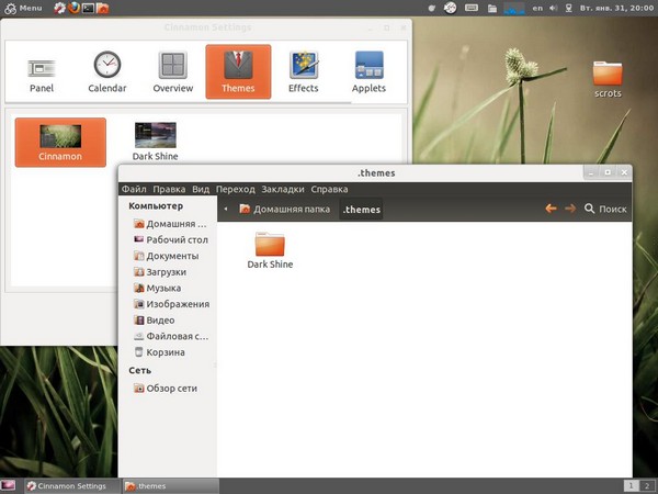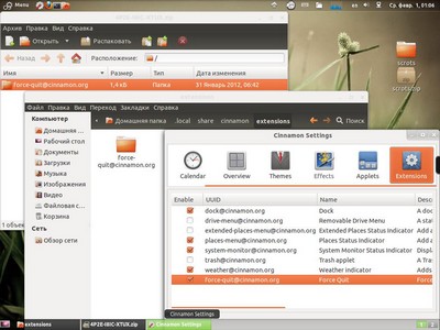 Аналогичным образом надо поступать с апплетами и расширениями. Только их папки надо помещать в подкаталоги домашней директории .local/share/cinnamon/applets/ и .local/share/cinnamon/extensions/ соответственно.