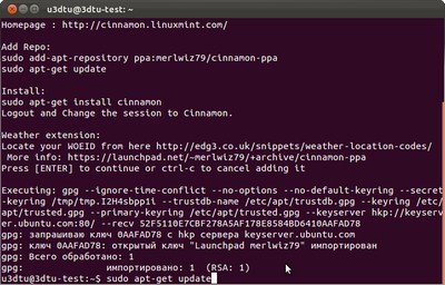В качестве примера мы установим Cinnamon 1.3 и немного ближе познакомимся с ней в среде Ubuntu 11.10, хотя разработчики уже подготовили сборки и для других популярных дистрибутивов. Кстати, не забывайте, что проект всё ещё находится в экспериментальной стадии, поэтому местами он не очень стабилен, а то и вовсе не работает. Также для него требуется аппаратная поддержка 3D-ускорения и соответствующие драйверы для вашей видеокарты. Если готовы рискнуть, то выполните несколько простых шагов, описанных ниже. Начать стоит с запуска терминала (Terminal) и добавления PPA-репозитория проекта. Затем надо обновить список пакетов.