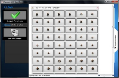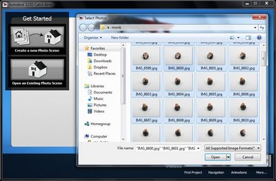 В любом случае всё «приходит с опытом». Придётся отснять не один десяток фотографий, прежде чем получится достойная модель. Потренируйтесь сначала на каких-нибудь простых геометрических фигурах, расположенных на однородном фоне. Кстати, попытка воссоздать сложные поверхности вроде меха или волос практически наверняка будет провальной. А пока рассмотрим вкратце работу с программой. Тут всё очень просто. После запуска кликаем Create a new Photo Scene и выбираем фотографии, по которым будет строиться объект. Для начала стоит взять набор из 15-20 кадров, снятых с разных ракурсов, но под одним углом к поверхности, на которой стоит объект. Потом можно будет добавить к сцене и другие фото.