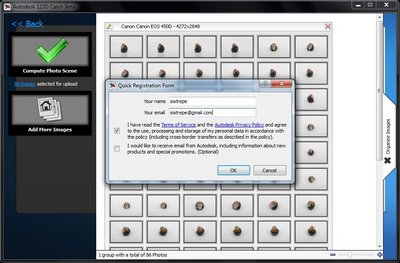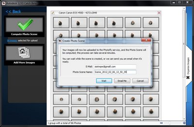 Нажимаем кнопку Compute Photo Scene, вводим имя и e-mail и соглашаемся с условиями использования сервиса. Обязательно вводите рабочий почтовый адрес, так как на него потом будут приходить уведомления и ссылки на готовые сцены. Впрочем, если у вас есть желание и время, то в следующем диалоге можно выбрать Wait вместо Email Me. Тогда программа свернётся и в фоне загрузит все фотографии на сервер, дождётся результата и снова активируется. В среднем загрузка файлов на сервер занимает несколько минут, а время выдачи готового результата составляет не более 10-15 минут. Если вы добавляете к сцене ещё несколько фотографий или меняете её, то все файлы заново заливаются на сервер и обсчитываются, что несколько раздражает.