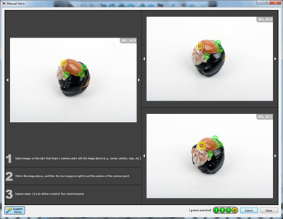 В открывшемся окне надо отметить одни и те же точки (желательно все четыре) на трёх выбранных фотографиях. После выбора точки на одной-двух фотографиях программа зачастую сама предлагает точку на третьей. Можно кликнуть по ней и точно спозиционировать её при большом увеличении. После корректировки модель снова отправится на обсчёт в облако. Помимо экспорта объекта можно сделать видеоролик, задав позиции камеры и задержку на каждой из них. Например, облёт вокруг модели или панораму (если вы снимали какую-нибудь площадь, находясь в её центре). Видео кодируется уже на клиентской машине, а не в облаке.