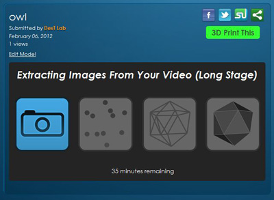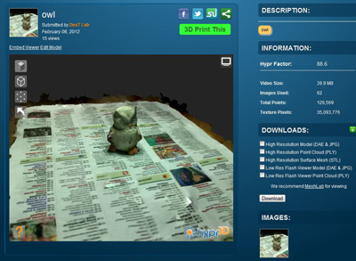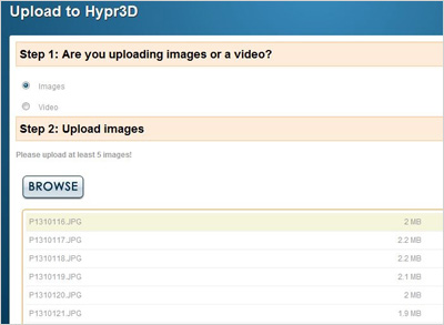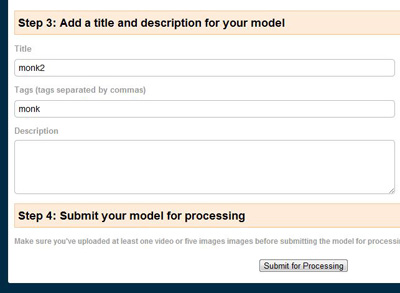 Перейдём к особенностям работы с указанными сервисами. Начнём с Hypr3D. Нажимаем кнопку Upload и переходим к загрузке исходных файлов. Выбираем нужные изображения или видео, вбиваем название и теги для нашего проекта и жмём Submit for processing. У этого сервиса один нюанс: он без проблем работает с видео, снятым на iPhone/iPod Touch (обычно хватает полуминутного ролика с «облётом» объекта), но для всех прочих требует наличия thm-файла. Впрочем, сервису удалось успешно скормить файлы MOV и 3GP, снятые смартфонами.