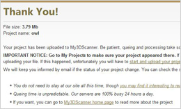 My3DScanner генерирует субъективно менее качественные модели, чем Hypr3D. Тем не менее пользоваться им вполне можно. Начать создание проекта надо с выбора пункта My Studio → Create. Задаём имя и загружаем фото или видео, обязательно упакованные в архив. Время обработки зависит от загруженности сервиса. На видео, естественно, уходит больше времени. А вообще даже примерные сроки назвать очень трудно. Один из тестовых примеров обработался за 20 минут, а на другой ушло почти три часа.