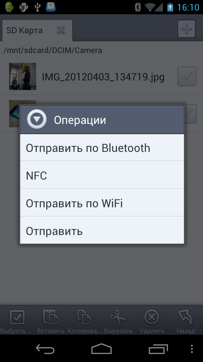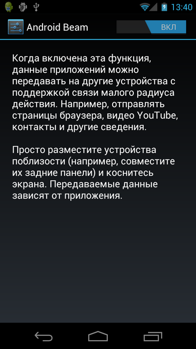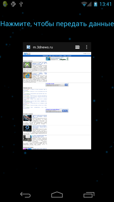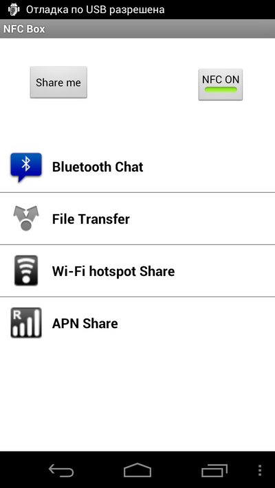 Ещё одно применение NFC – передача данных между двумя устройствами. В самой ОС уже есть такая функция – Android Beam. Если она включена, то в любой момент можно поднести один смартфон к другому и, в зависимости от контекста, передать URL, фотографию или что-то ещё. Скорость передачи данных непосредственно по NFC не так уж высока, поэтому зачастую “нежные прикосновения” смартфонов служат только для инициализации подключения через Bluetooth или Wi-Fi, а уже по ним можно пересылать файлы или просто общаться. В Android практически во всех стандартных приложениях можно поделиться информацией с другим смартфоном. Альтернативой могут послужить утилиты вроде Blue NFC или менеджер файлов FileExpert, а также NFC Box для чата и организации хот-спота.