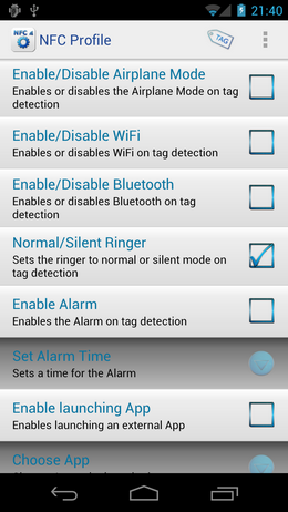 Ну а с помощью этой утилиты мы можем задействовать в качестве полезной нагрузки те же самые использованные билетики на метро. Список доступных действий хоть и ограничен, но не так уж мал – регулировка громкости, включение и выключение беспроводных интерфейсов, эмуляция мультимедийных клавиш, запуск приложения, показ всплывающего сообщения и так далее. На одну метку можно “повесить” сразу несколько действий. Например, придя домой и приложив смартфон к “билетику”, вы автоматически выключите Bluetooth, включите Wi-Fi и переведете его в тихий режим.