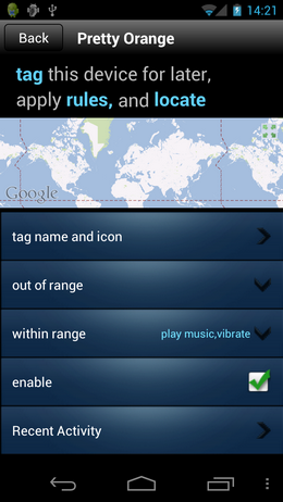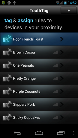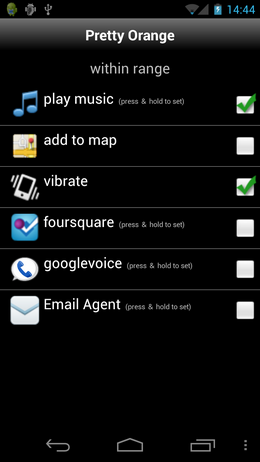 Чуть меньшими возможностями обладает программа ToothTag – она позволяет всего лишь проиграть мелодию, включить вибрацию, сделать отметку на карте, отметиться в Foursquare, открыть почту или Google Voice. Любой набор из этих действий можно привязать не только к имеющейся метке (билетики-билетики), но и к наличию определённых устройств Bluetooth или Wi-Fi в зоне видимости. Действия настраиваются как для входа в зону, так и для выхода из неё.