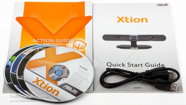 В комплекте с устройством поставляется полуметровый Y-образный USB-удлинитель для дополнительного питания, парочка хорошо оформленных книжек-инструкций и четыре DVD-диска (привод в ноутбуке аж завыл от удовольствия). На одном из дисков находится фирменный софт и драйверы, а на трёх других — заточенные под Xtion игры: Dance Wall (танцевальная аркада), Beat Booster (гонки) и Maya Fit Cardio Lite (виртуальный фитнесс-тренер). Минут через пятнадцать после открытия коробки вы уже сможете наслаждаться новым интерфейсом взаимодействия с ПК.